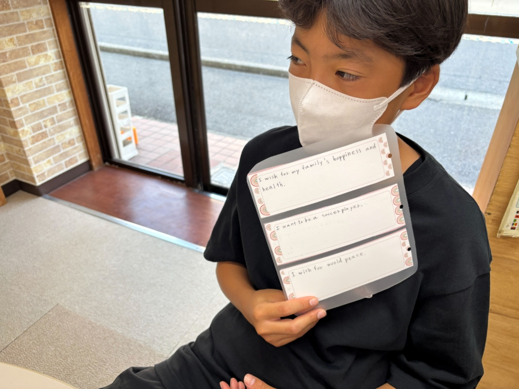 七夕の短冊、願い事もしっかり英語で書けてますよー!